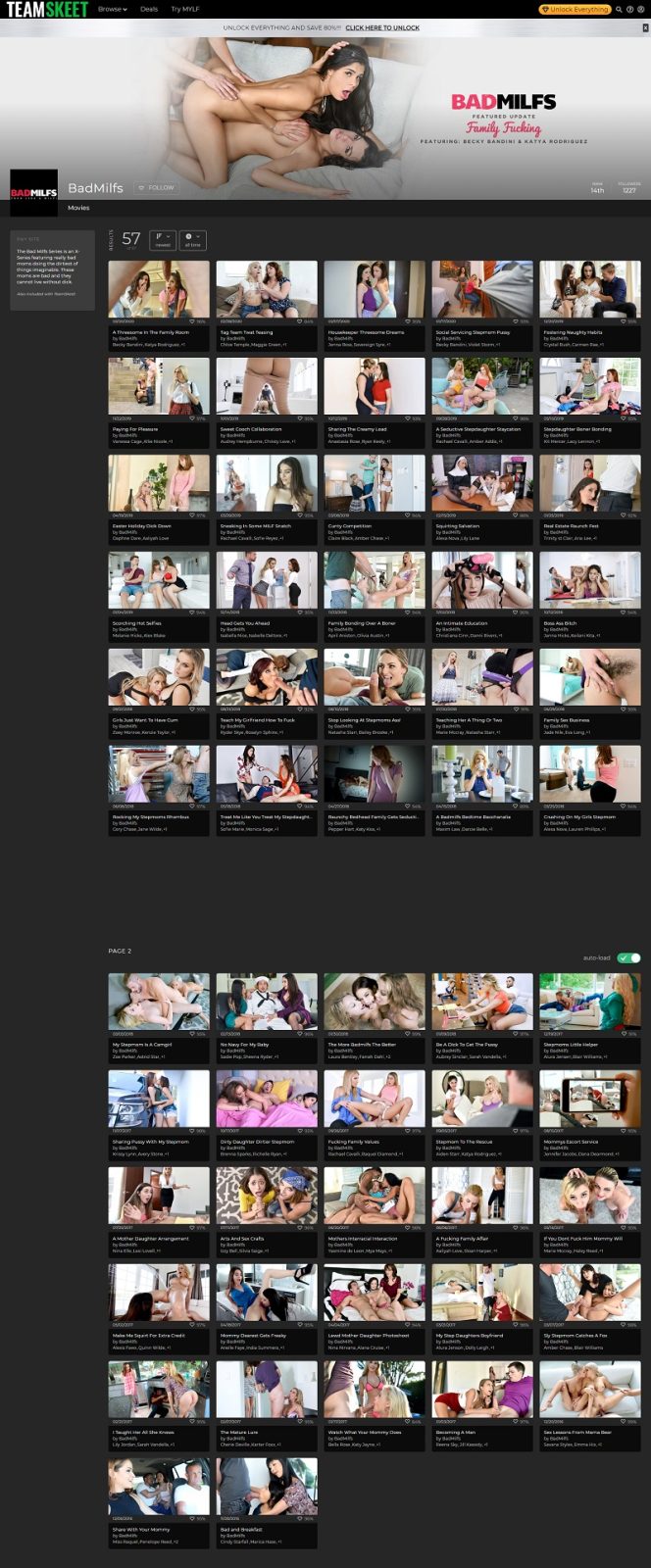 62 videos. That's the entire standalone library. I logged in expecting more and realized quickly that Bad MILFs isn't really a site — it's a channel inside Team Skeet's network. The concept is simple: mature women in taboo-adjacent scenarios with younger performers.